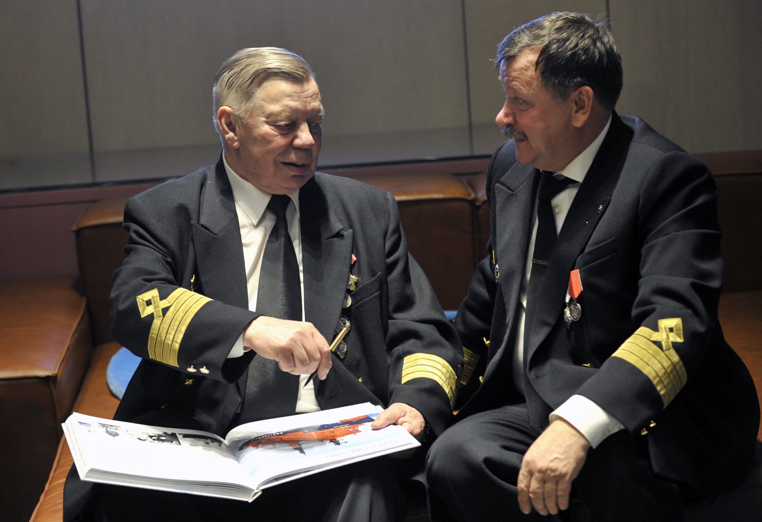 3 декабря 2019 года. День 60-летия атомного флота. Капитан Станислав Шмидт (слева) делает памятную запись в книге «Атомфлот. История в фотографиях», вспоминая совместную работу с капитаном Александром Спириным (справа) на атомном ледоколе «Советский Союз».
