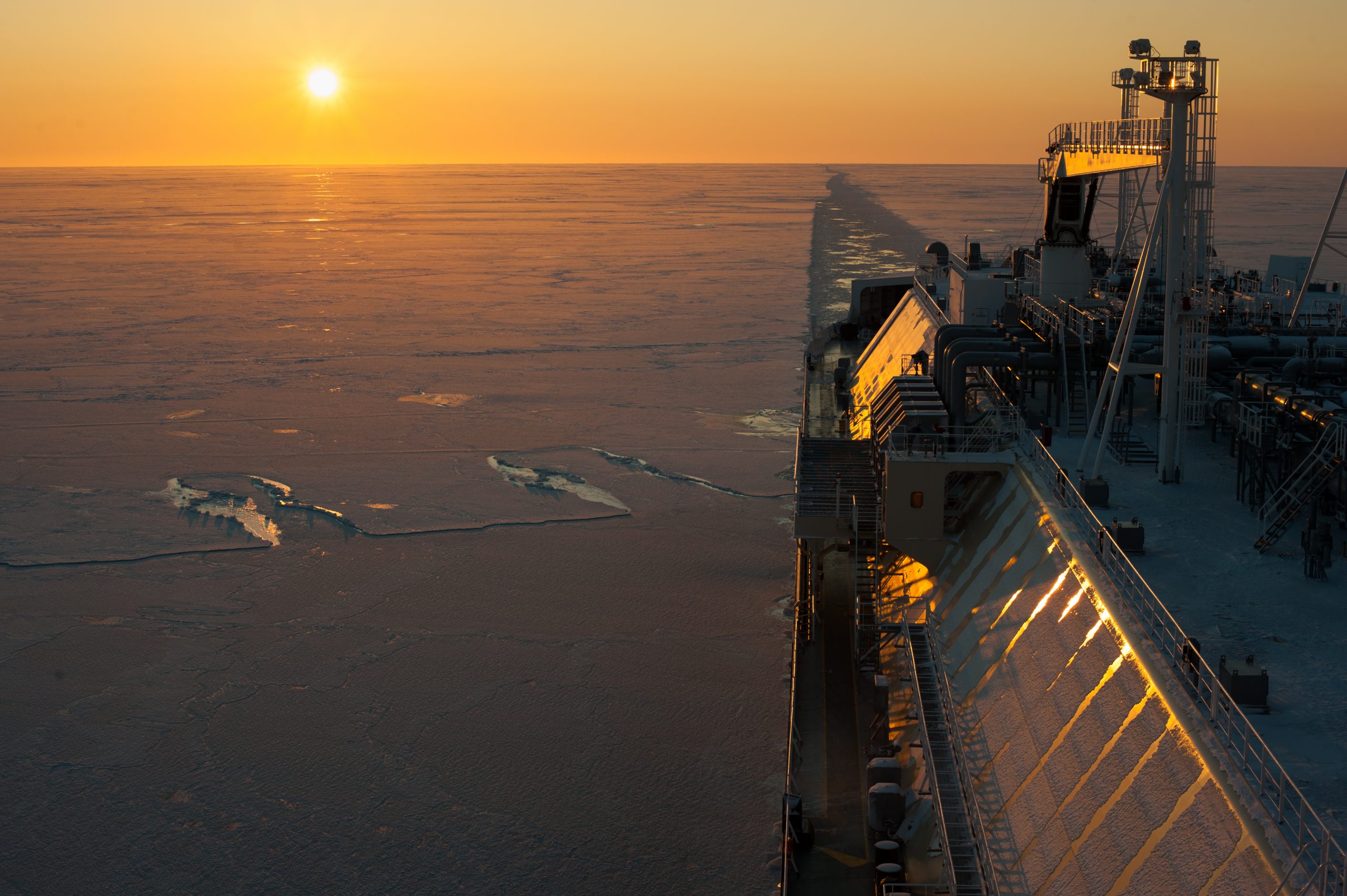 Газовоз «Кристоф де Маржери» на испытаниях. Судно идет в ледовом поле кормой вперед. Оно оснащено дизель-электрической силовой установкой, мощность на винтах — 45 МВт. Такие судна способны ходить во льду носом либо кормой вперед и самостоятельно преодолевать лед толщиной до 2 м.